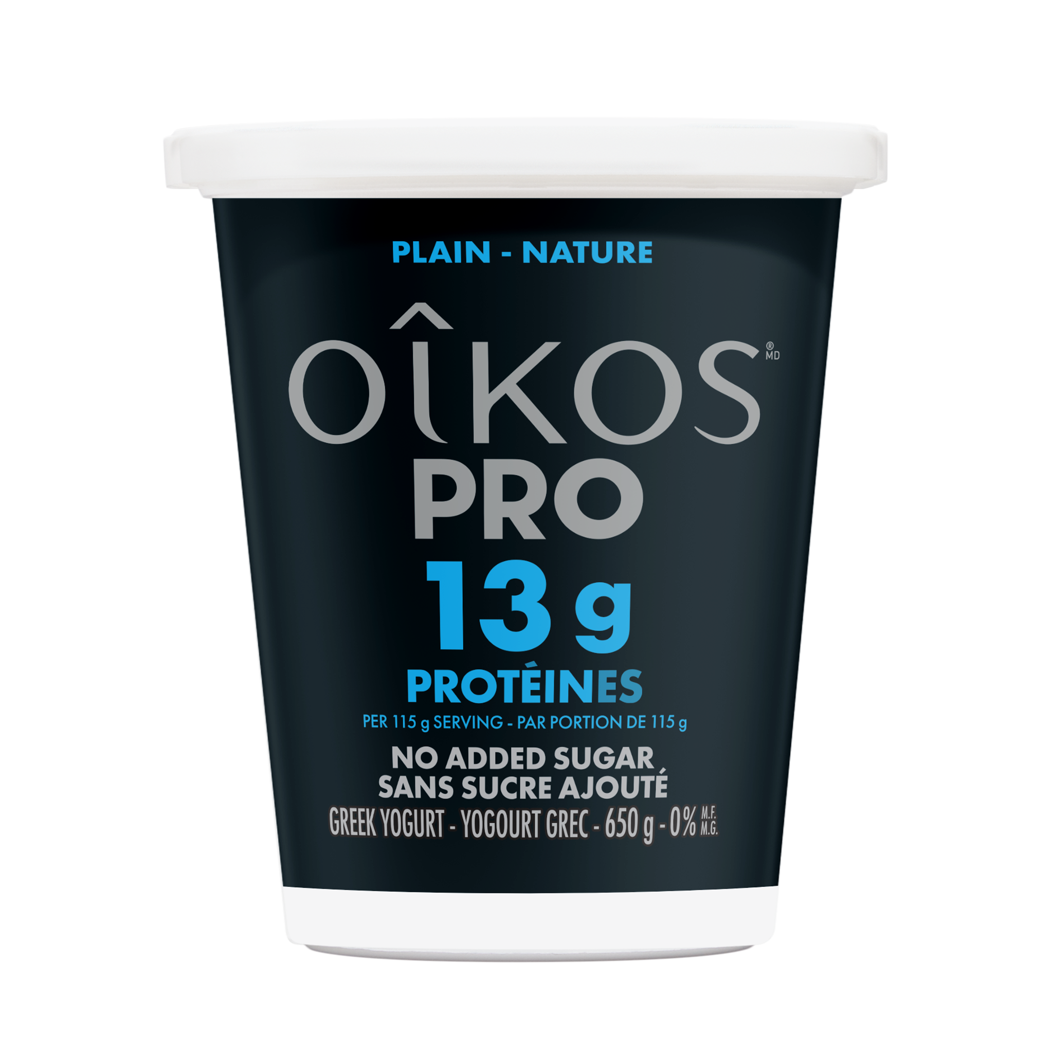 Alimente ta journée avec le nouveau yogourt grec Oikos Pro—disponible en versions nature, vanille et saveurs fruitées—tes papilles vont adorer.
