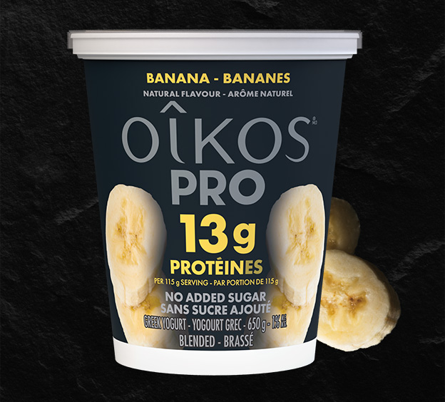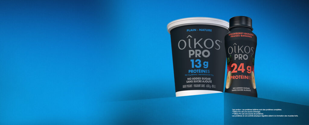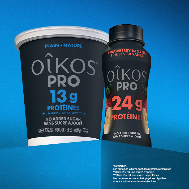 Le NOUVEAU yogourt grec Oikos Pro, c’est jusqu’à 24g de protéines complètes* pour carburer** et nourrir ta force***. Peu importe où tu es dans ton parcours, chaque cuillerée te rapproche de tes objectifs!