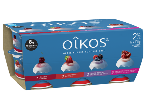 Looking for a yogurt the whole family can agree on? The Oikos 2% M12 pack brings together four crowd-pleasing flavours — Cherry (8 g protein), Mixed Berries (8 g), Strawberry (8 g) and Raspberry-Pomegranate (8 g) — in one fresh and creamy collection.